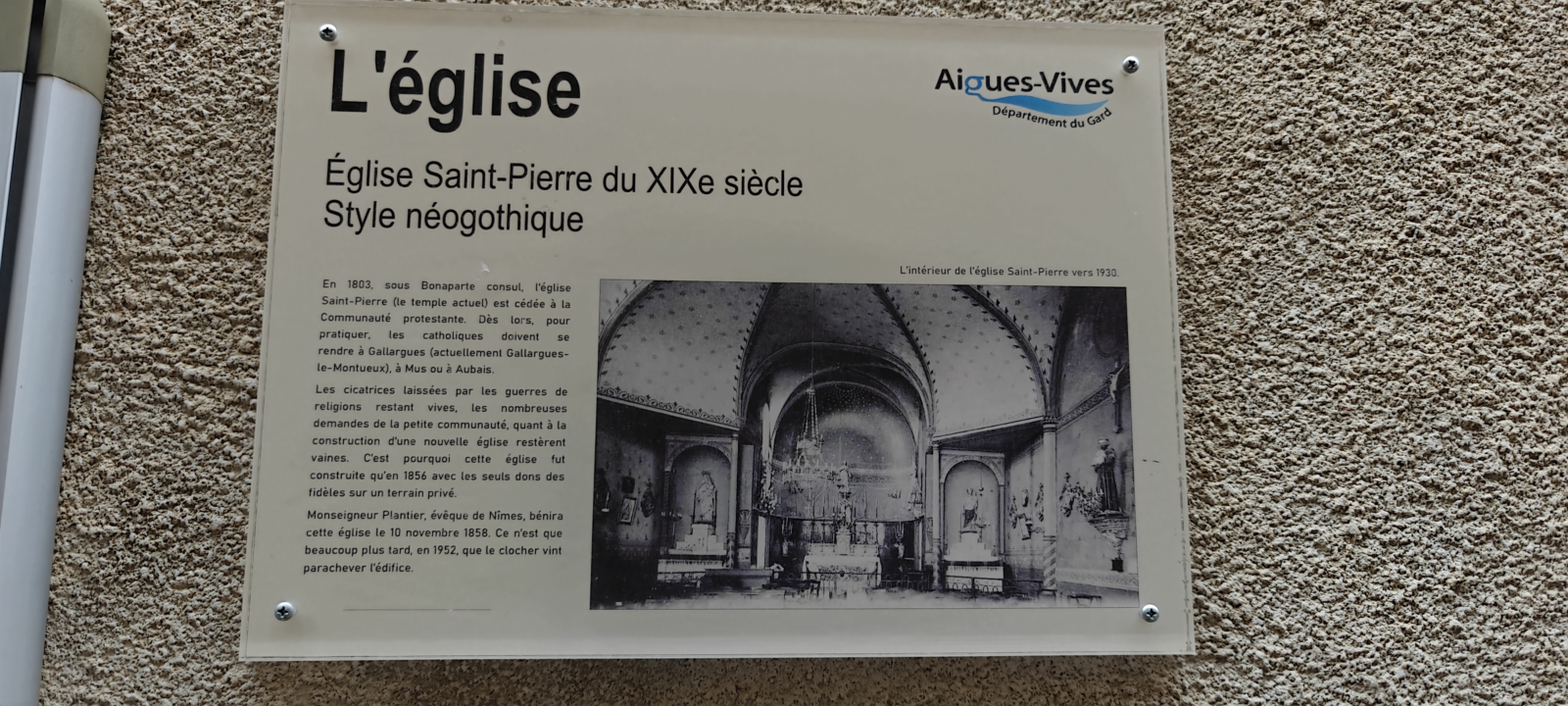 Les catholiques, privés de lieu de culte, firent appel à la générosité locale et à l’appui de l’évêché de Nîmes pour reconstruire leur église. La nouvelle église Saint-Pierre, de style néogothique, fut érigée en 1855 dans le quartier du Cantonnat.