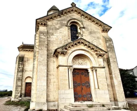Elle est posée au milieu des vignes, avec son style néo-roman assumé et son élégant clocher surmontant le dôme central.